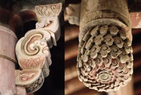台柱出束腰覆莲垂柱承托双挑檐檩,垂柱间置花牙子,透雕回形纹、卷草纹、凤鸟纹、花卉纹、蝙蝠纹等,花蕊和柱头处嵌有蓝色玻璃。转角处置斗拱状斜撑承托出柱檐檩,部分已缺失,斜撑上用压地隐起法雕刻卷草纹、花卉纹。出柱榫头刻成麻叶状耍头。转角挑檐枋处绘戏曲故事图案。角梁下老角梁处置束腰瓜楞垂柱。