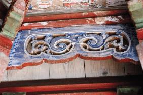 台柱出双下昂承托双挑檐檩,挑檐檩下悬花篮垂柱,柱间置挂落,已缺失,柱身镂空,斜置柱头出跳之双下昂,昂身刻成象鼻状,部分昂头被割掉。二昂上置小斗承托麻叶状耍头和外挑檐檩,底部用小木栓固定小斗。屋面歇山造,施飞椽。脊头不施脊兽,仅以瓦片做出尖叶状。檐口施瓦当,部分现已缺失。勾头图案为蝙蝠纹和回形纹,滴水图案为双蝠捧寿纹。