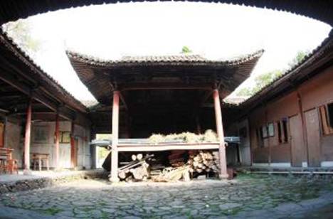 戏台坐北朝南偏西,面对正厅。方形平面,台面铺设杉木板。四角立圆木柱,柱下置圆鼓形花岗岩柱础承托。戏台设前后台,后台用木质台阶与门厅连接。后台柱与抱柱间置飞罩,透雕回形纹和花卉纹等。抱柱间置四面槅扇固定分隔前后台。槅扇的第一层绦环板透雕蝙蝠纹、花瓶纹等,第二层绦环板内刻线样兜肚,兜肚内用压地隐起法雕刻花鸟纹。内额枋上置匾额“一昔千古”。