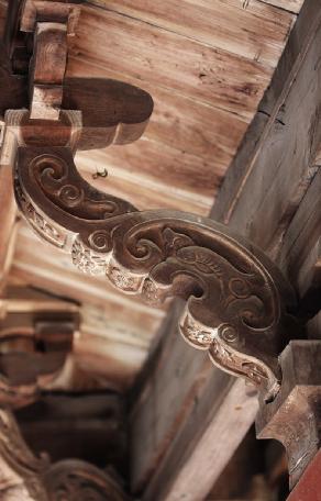 台柱柱头置圆栌斗,斗下柱间为额枋。枋头做卷杀,不施雕刻,枋下置水波纹雀替承托。额枋上立坐斗出正心瓜拱承托正心枋。坐斗向内出斗拱、施令拱承托平祺天花。斗拱刻成曲线状,拱上刻夔龙纹、蝙蝠纹、花卉纹、铜钱纹、暗八仙、长寿纹等多种纹饰。拱下置木销固定。天花内用天花枋做成棋盘状。台柱出双下昂承托双挑檐檩,头昂两侧置异形斗拱,转角处每组双下昂间用瓜拱连接,昂下置斜撑承托。出柱榫头刻成麻叶状耍头。屋面歇山造,翼角起翘,施双飞椽。